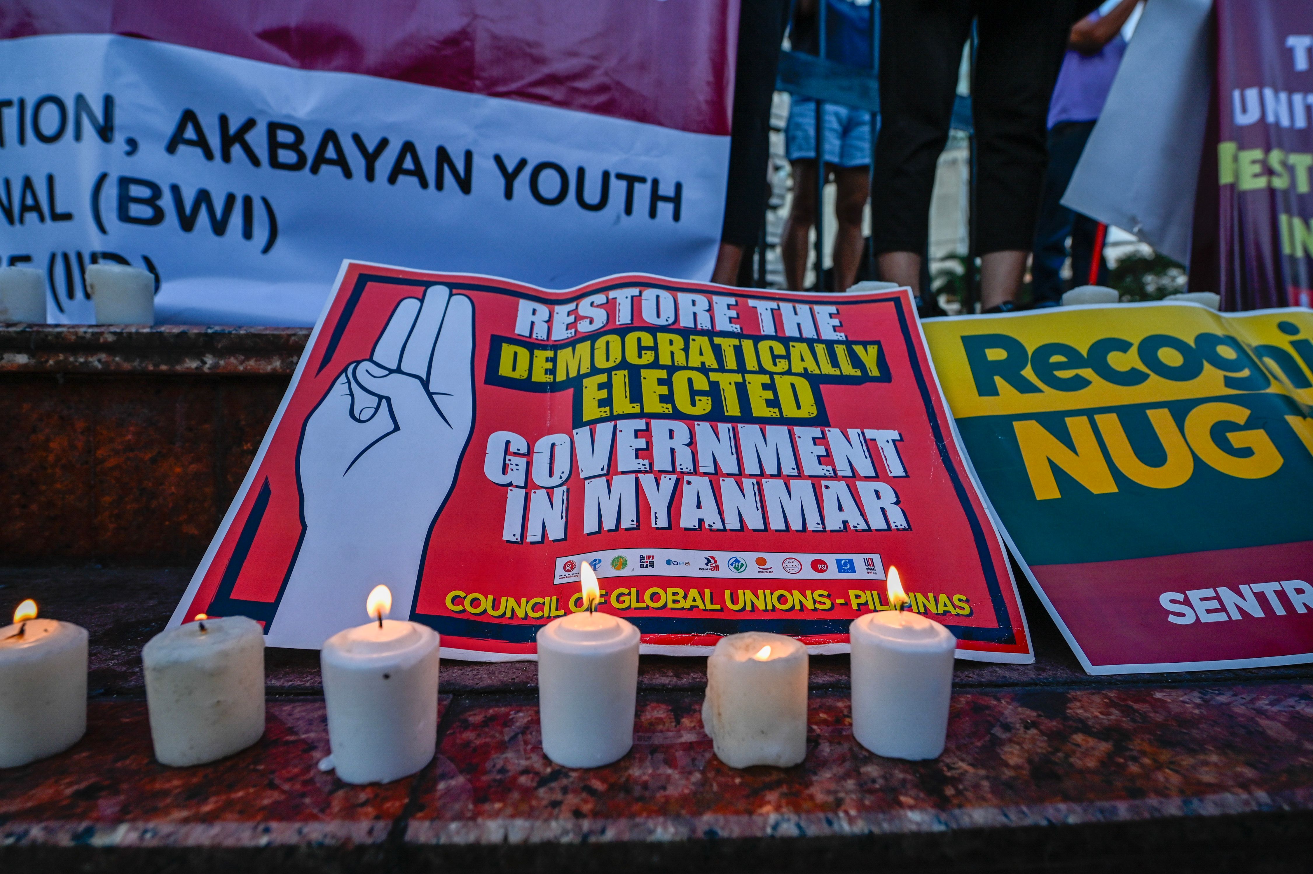 Members of the Burma Solidarity Philippines (BSP) coalition, Akbayan Youth, and Initiatives for International Dialogue (IID) hold a protest at the Boy Scout Circle in Quezon City on February 1, 2025, to mark the fourth anniversary of the military coup in Myanmar. The group called on human rights, peace, and democracy movements worldwide to strengthen solidarity in efforts to help overthrow the military junta led by coup leader Min Aung Hlaing. Maria Tan, ABS-CBN News